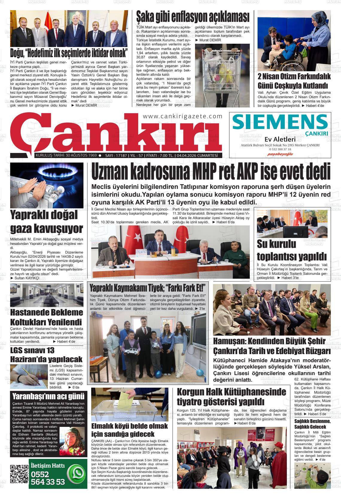 Çankırı Yerel Gazeteleri 04 Nisan 2026, Cumartesi Günü Manşeti
