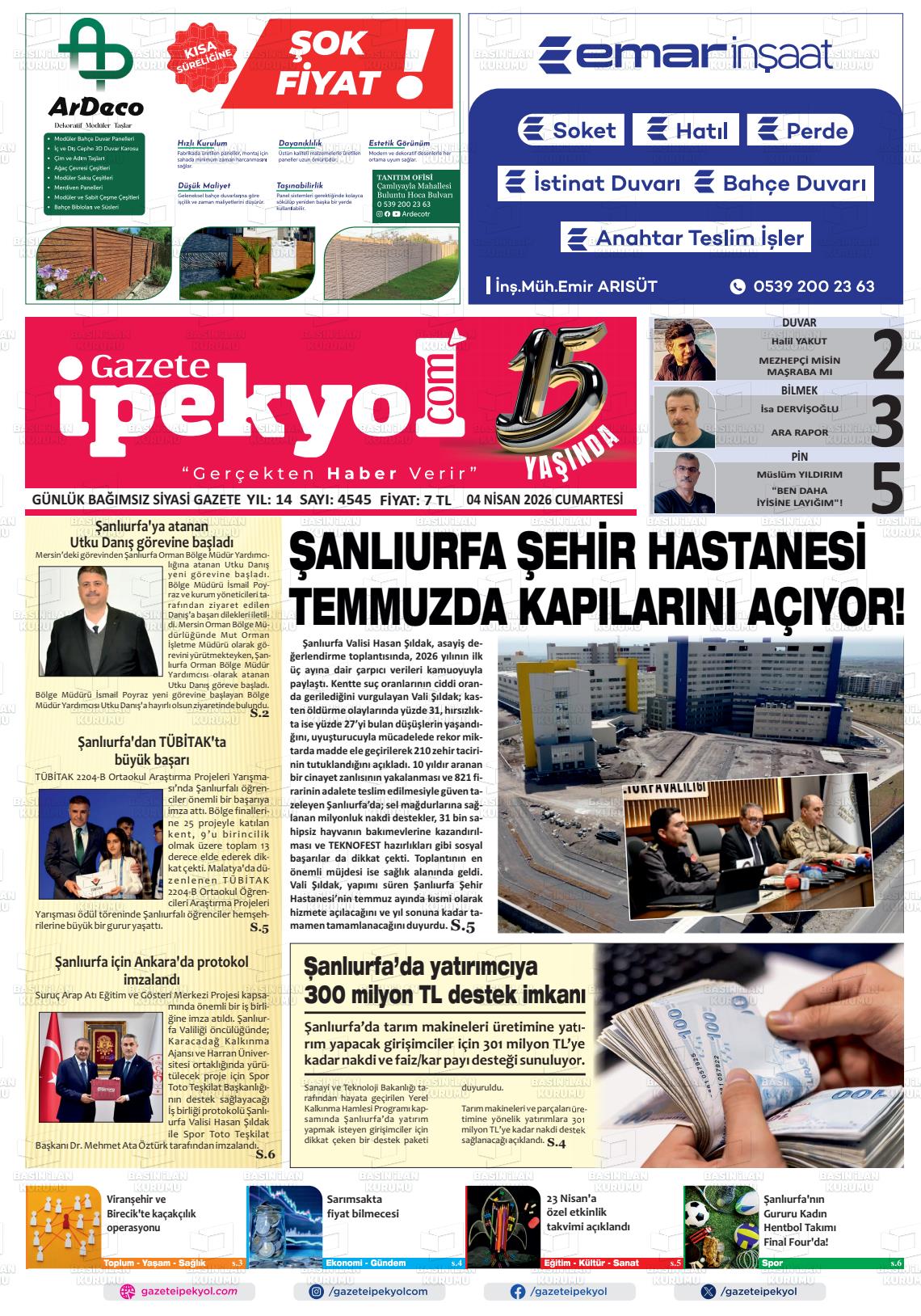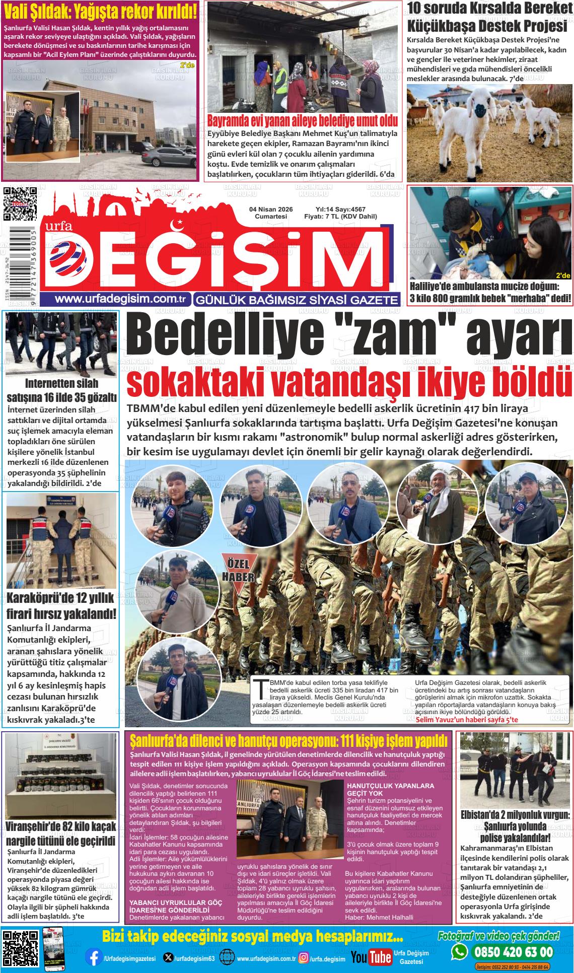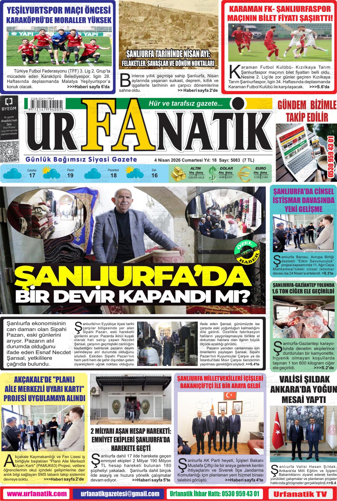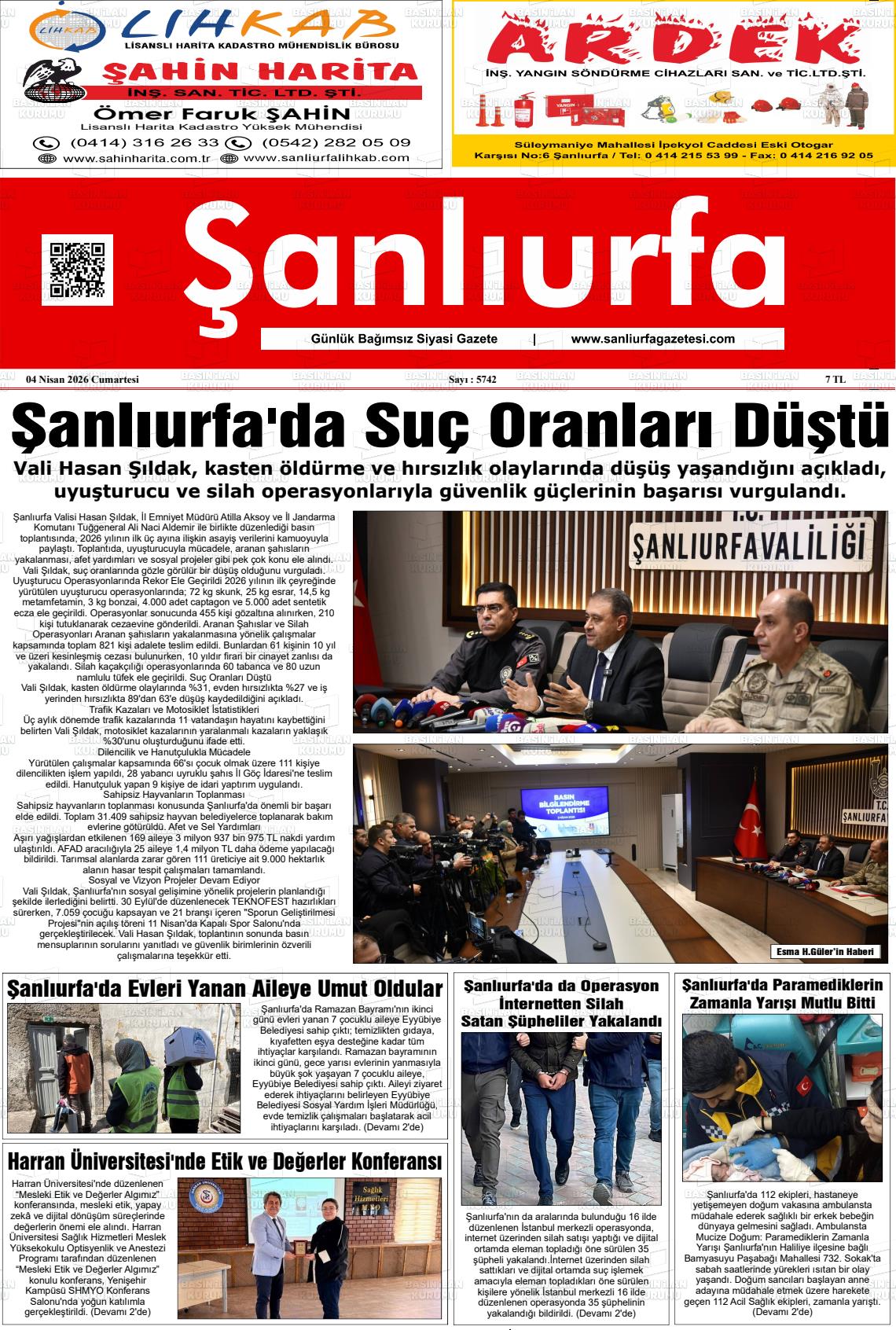 Şanlıurfa Yerel Gazeteleri 04 Nisan 2026, Cumartesi Günü Manşeti