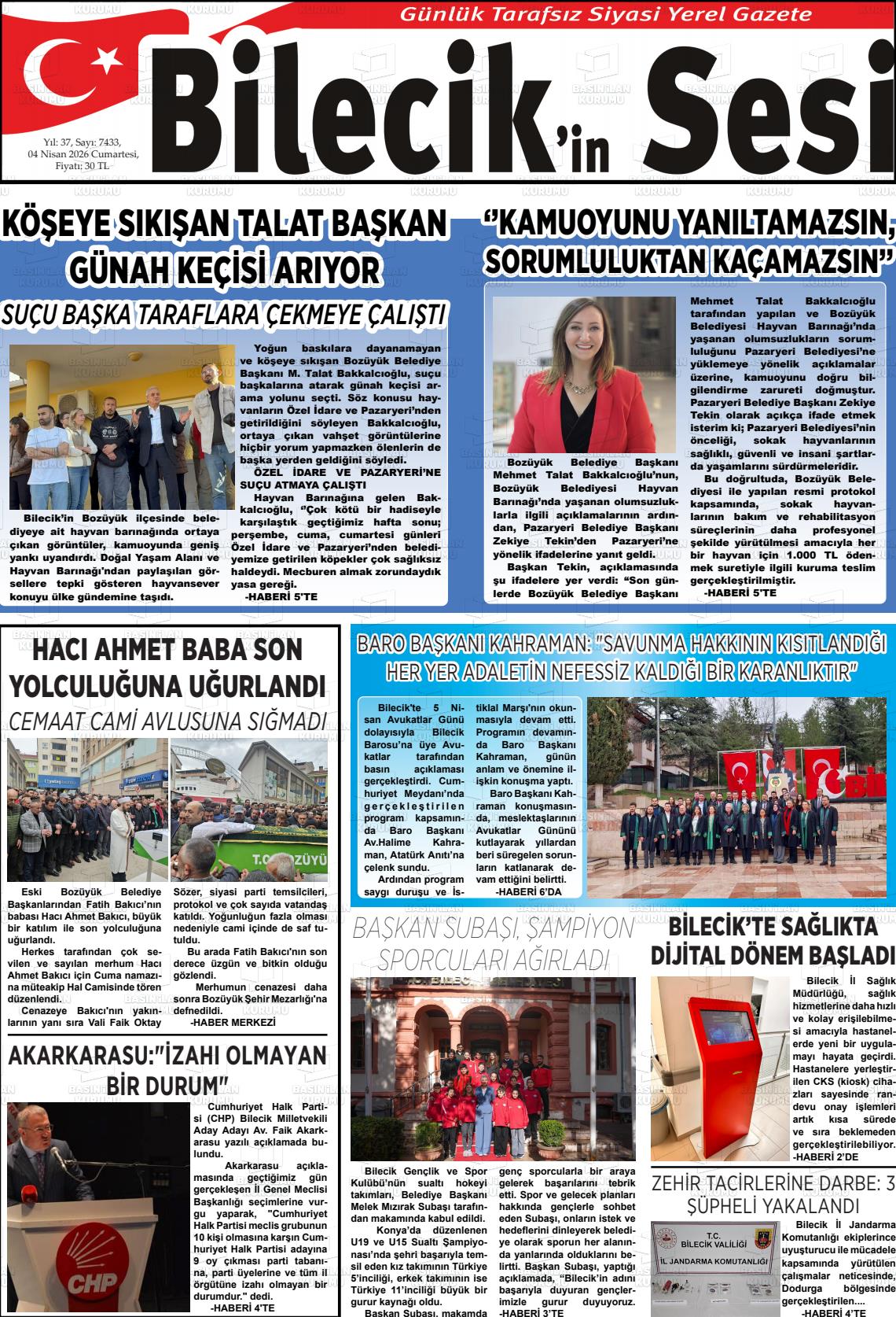 Bİlecİk Yerel Gazeteleri 04 Nisan 2026, Cumartesi Günü Manşeti