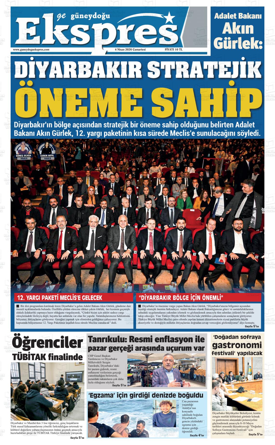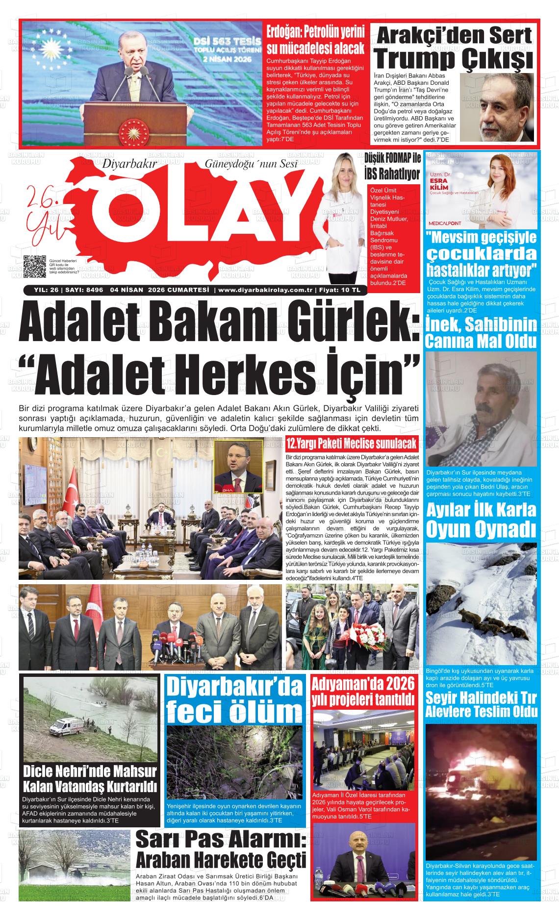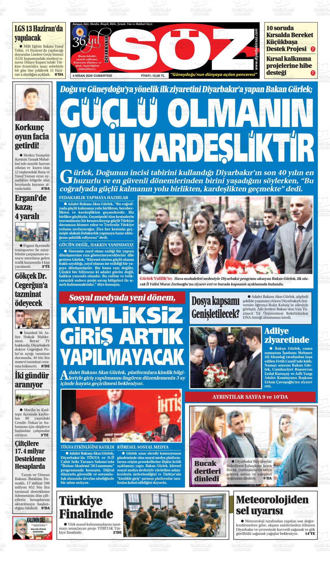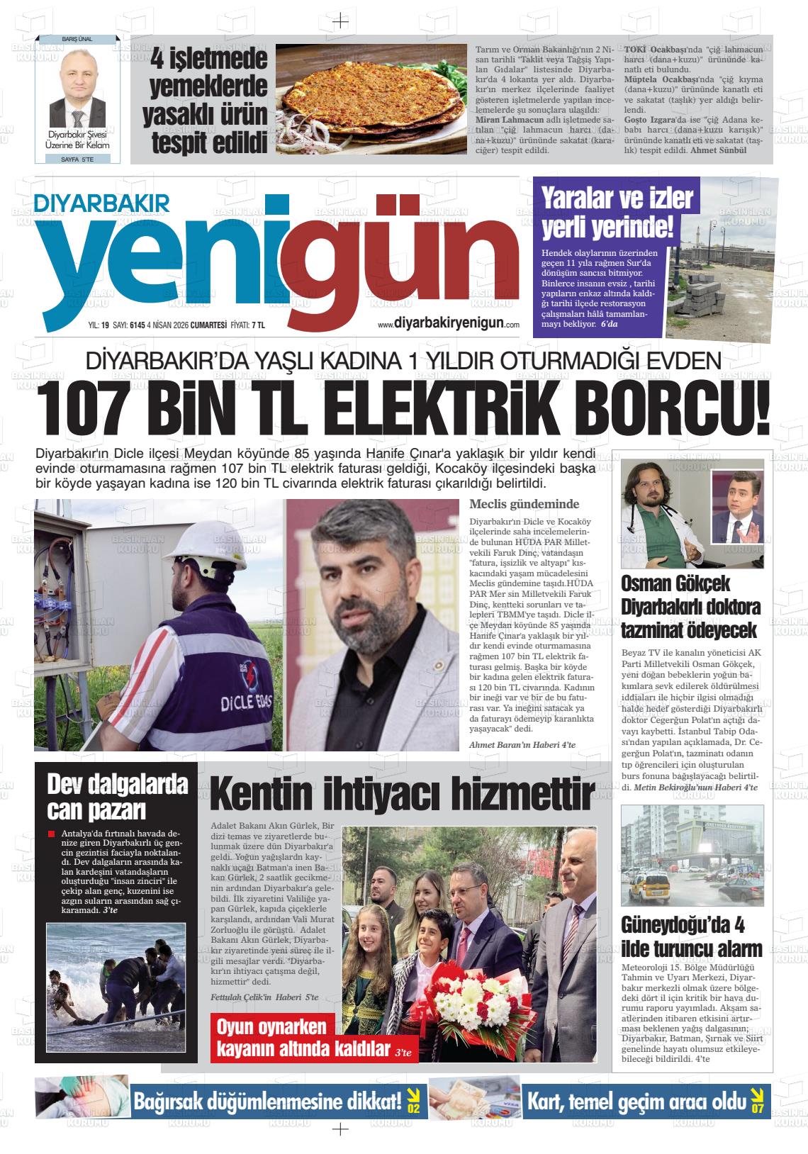 Dİyarbakır Yerel Gazeteleri 04 Nisan 2026, Cumartesi Günü Manşeti