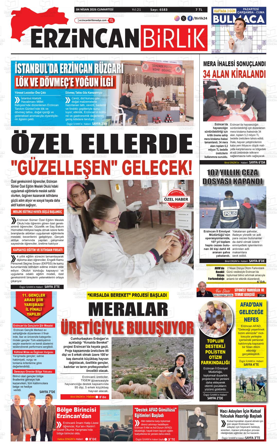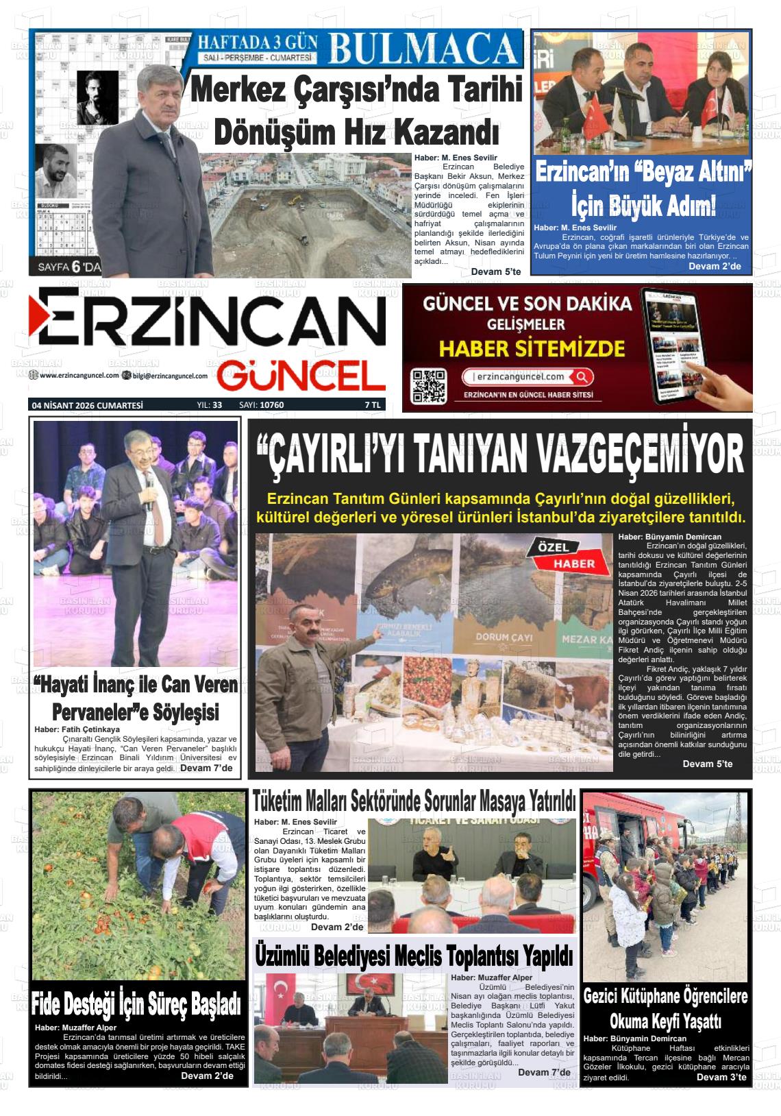 Erzİncan Yerel Gazeteleri 04 Nisan 2026, Cumartesi Günü Manşeti