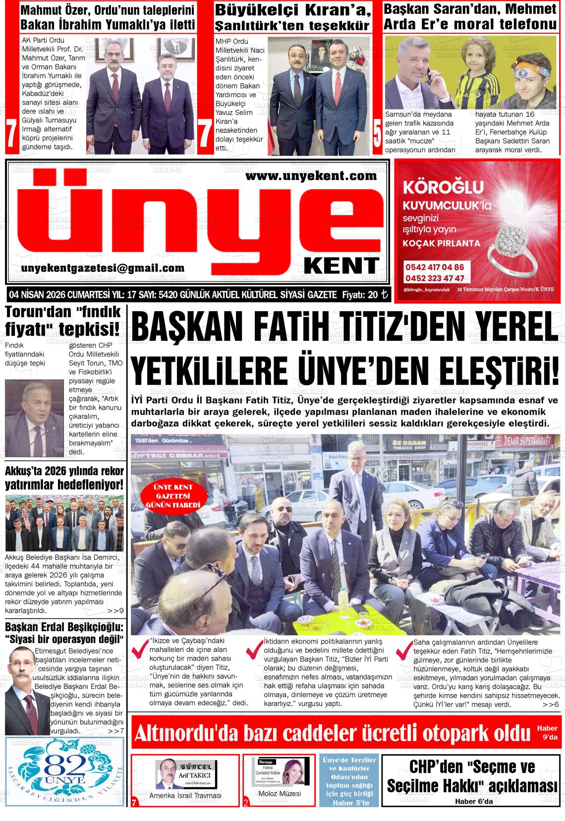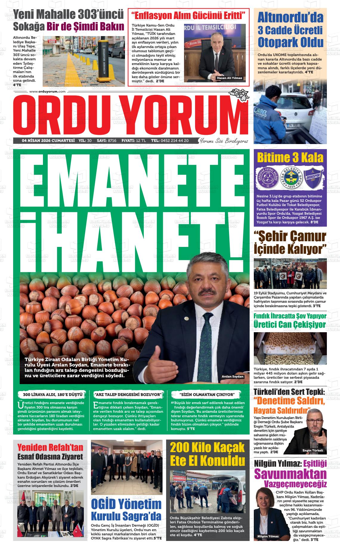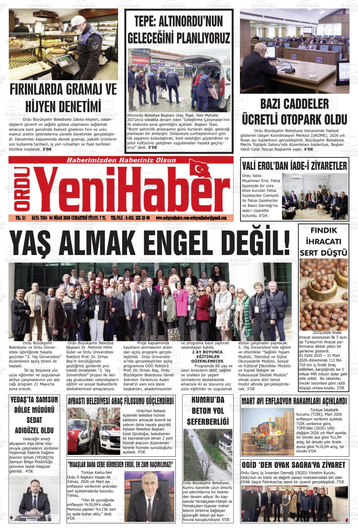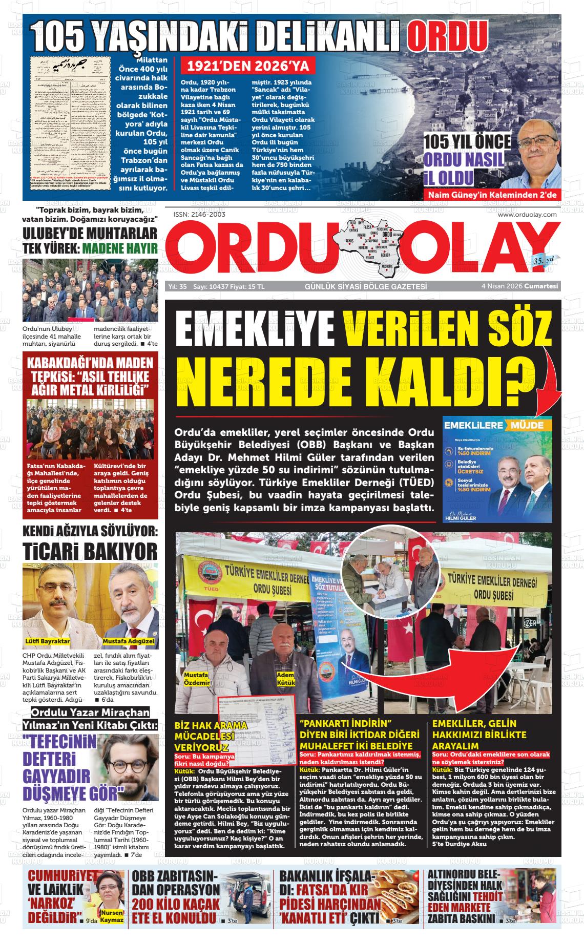 Ordu Yerel Gazeteleri 04 Nisan 2026, Cumartesi Günü Manşeti