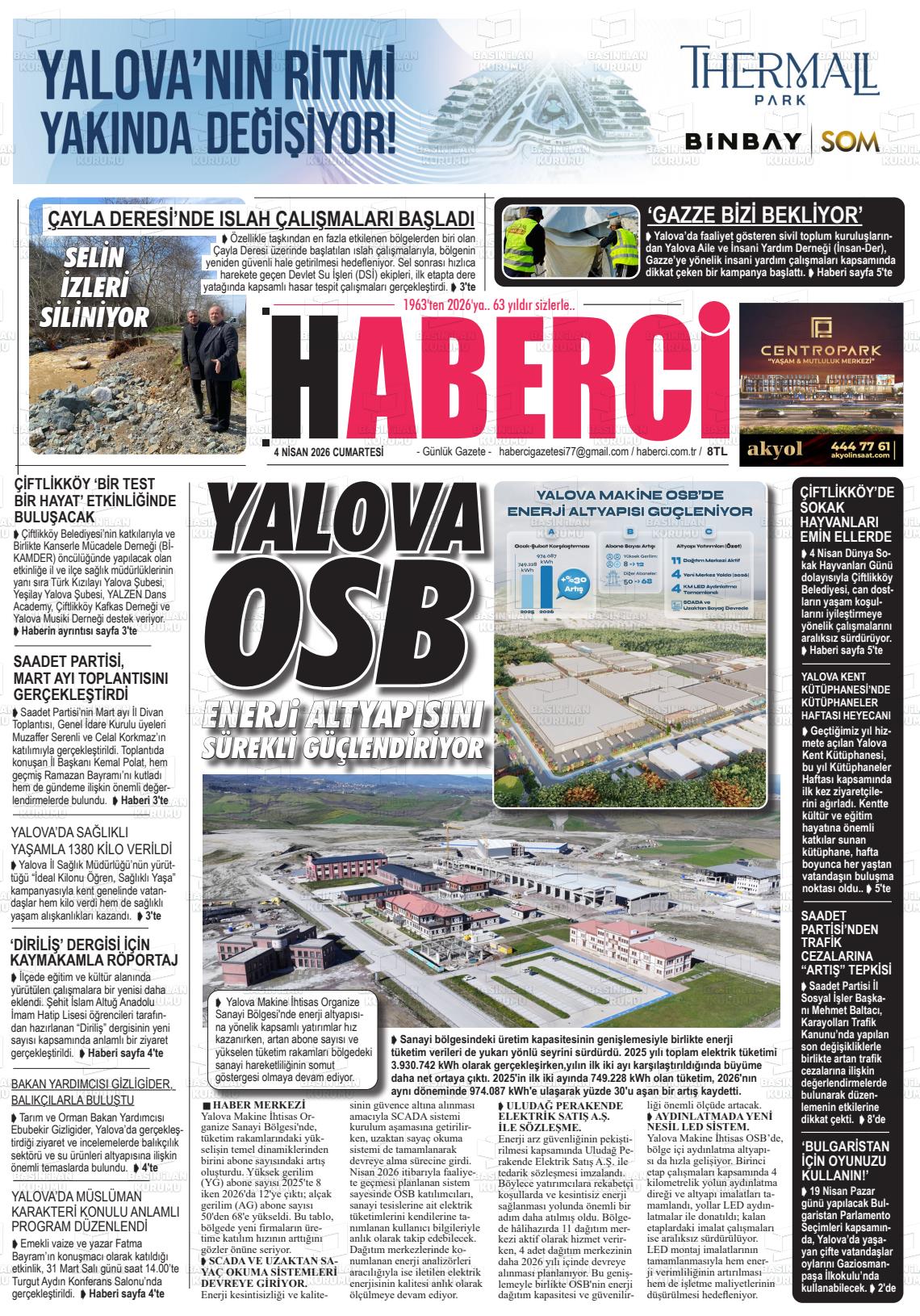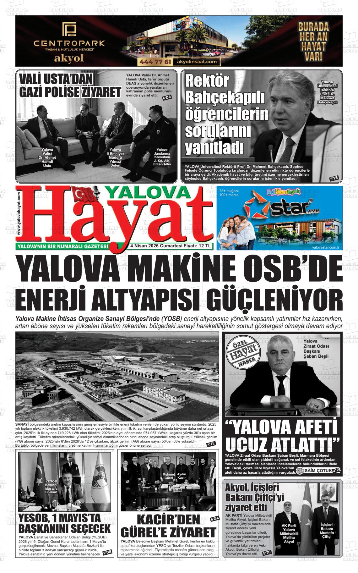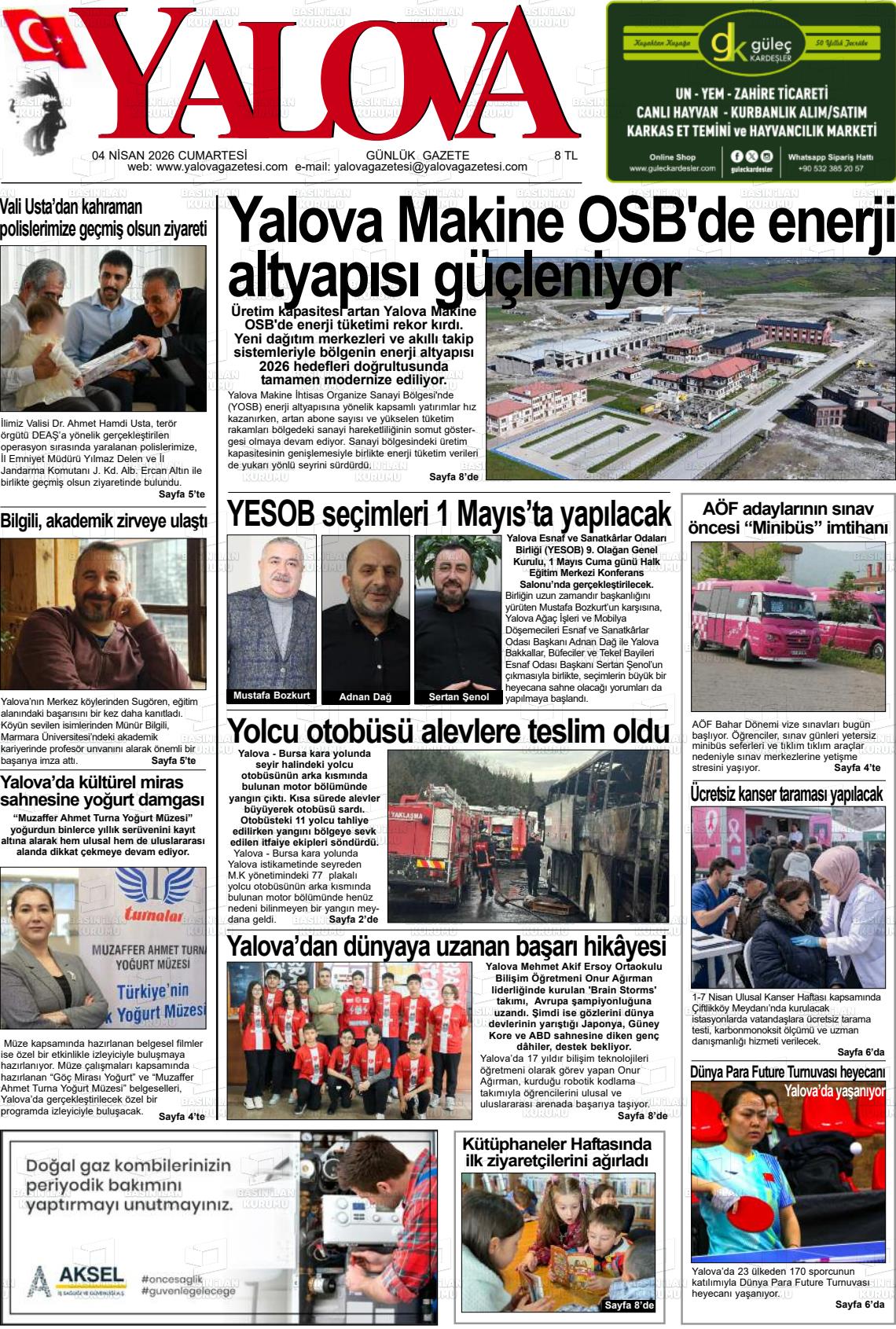 Yalova Yerel Gazeteleri 04 Nisan 2026, Cumartesi Günü Manşeti